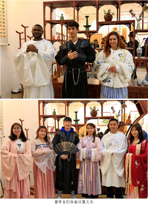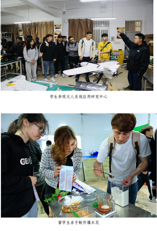 座谈会后,留学生参观无人系统应用研究中心,感受中国科技的飞速发展。在劳动实践教育活动中,留学生们亲手制作爆米花,到蔬菜大棚内进行拔萝卜、挖大蒜等劳动实践,体验中国田园生活的乐趣。在传统文化体验馆,留学生们试穿汉服,沉浸式体验茶道与书法,感受中国茶文化的宁静和谐,在p站