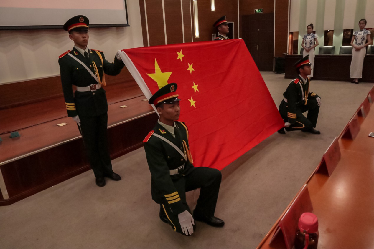 为庆祝中华人民共和国成立70周年,大会开始前,首先举行迎国旗、唱国歌仪式。