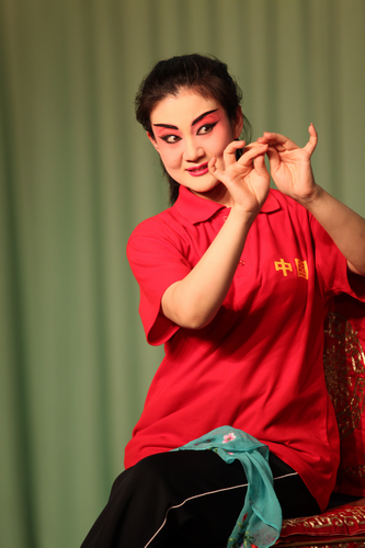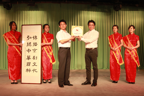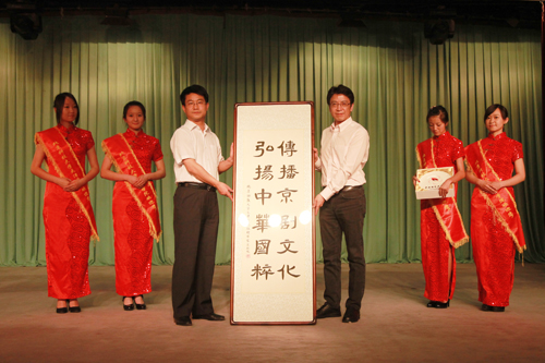 与国家京剧院领导互赠礼品。之后,国家京剧院院长宋官林先生为现场观众作了京剧知识讲座,宋院长从京剧的特点、表现形式、妆饰、配乐、身法等方面为大家讲解了博大精深的京剧文化,并由京剧院知名艺术家配合宋先生的讲解进行现场表演,展示了京剧的艺术魅力,宋先生的讲解和艺术家们生动的表演博得台下观众阵阵喝彩。