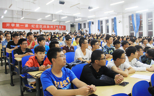 9教108教室面向全体大一新生开展了“走好大学第一步”暨纪念抗日战争胜利70周年“大学第一课”主题活动。学生处副处长、团委书记罗富臣,团委副书记潘柏夷、殷实、田勇,团委各部长、各系分团委书记及2015级新生辅导员参加了主题活动。