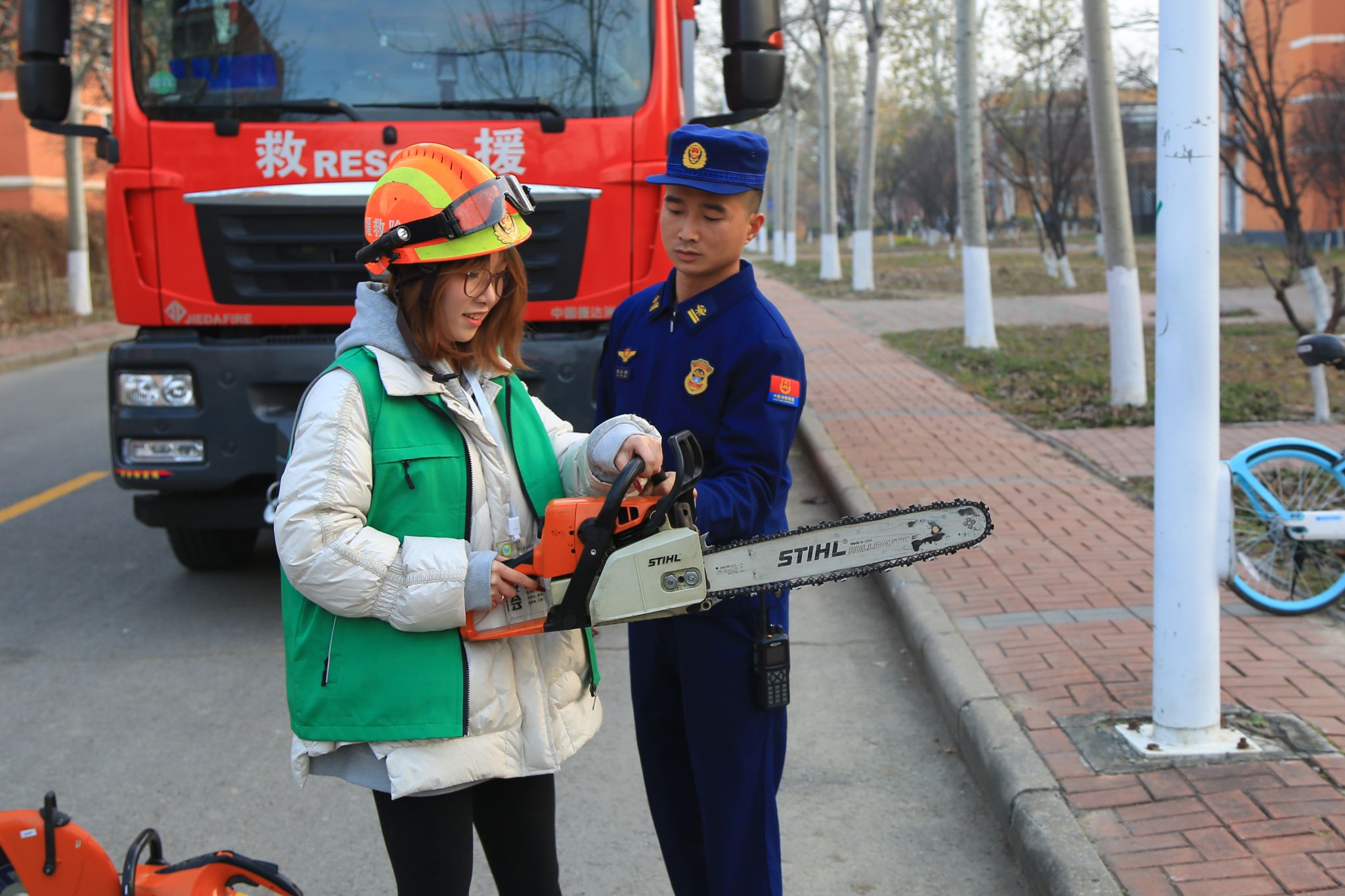 保卫处老师还为同学们带来了常见灭火救援器材使用方法讲解和展示,并指导同学们开展灭火实操演练。同学们踊跃报名,亲身体验穿着、使用消防救援装备,聆听消防指战员讲解火场逃生自护自救技能。