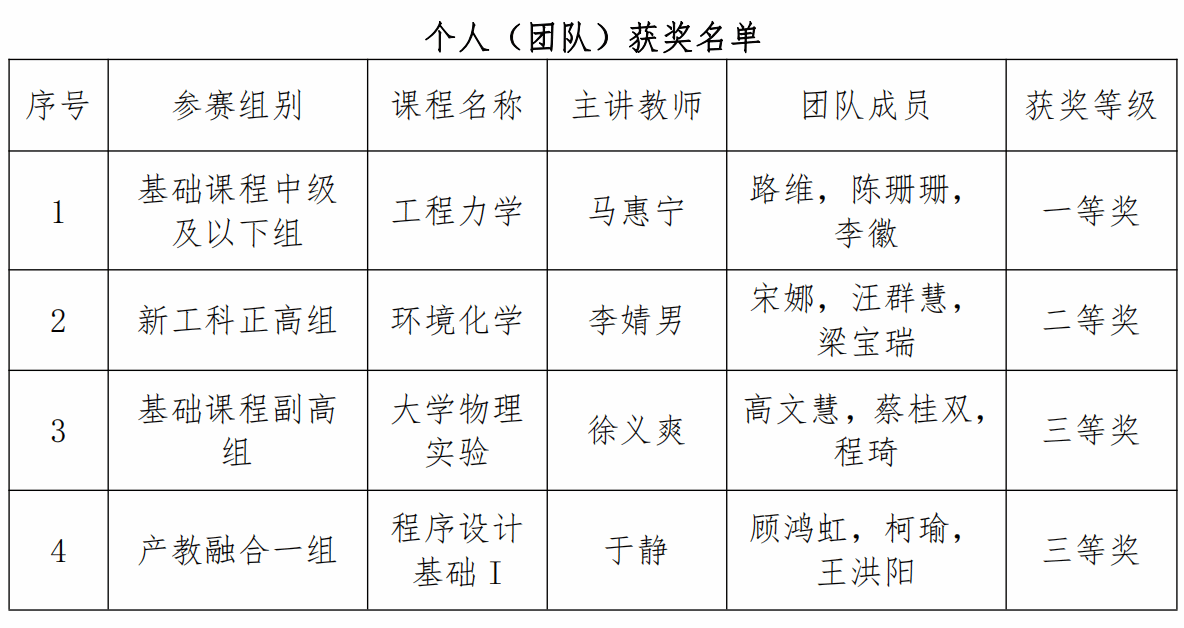 教师李婧男领衔的《环境化学》课程团队荣获“新工科正高组”二等奖;实验室管理中心教师徐义爽领衔的《大学物理实验》课程团队荣获“基础课程副高组”三等奖;信息工程p站