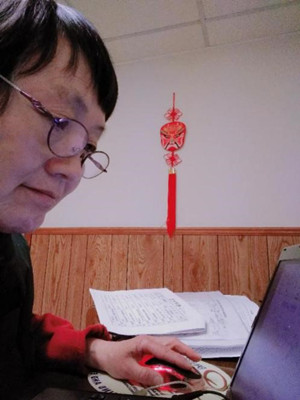 因疫情影响,李徽老师身在加拿大无法返回国内。由于时差12小时的原因,李老师的上课时间都在加拿大时间的深夜甚至凌晨。这对一个年过60岁的教师来说是件并不是件容易的事。为了不打扰家人晚上休息,同时保障上课质量,李老师将电脑和教学需要的所有资料全部搬到家中的地下室,以便夜深时在地下室里为学生们授课。地下室的温度较低,李老师也不得不在每次授课时都穿上了厚厚的棉衣。