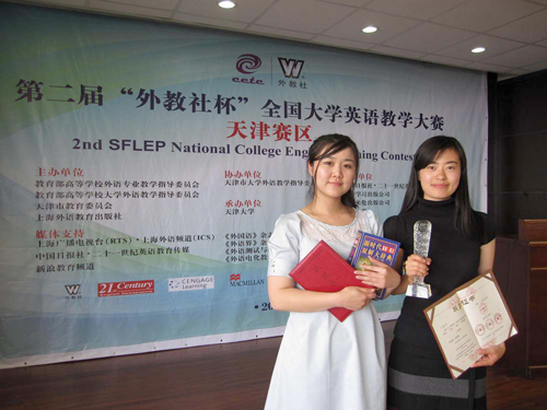 赴天津大学参加由上海外语教育教学出版社主办,天津大学承办的第二届“外教社杯”全国大学英语教学大赛(天津赛区)。大赛分综合组和听说组,来自全市26所高校的52位优秀教师参加了比赛,竞争极其激烈。于晓伟以复赛第一名的成绩进入综合组决赛,黄文婧以优异的成绩进入听说组决赛。决赛中,于晓伟以9.152分、总成绩第一名的优异成绩获得天津赛区综合组一等奖,将代表天津市参加全国大学英语教学大赛(全国总决赛)。黄文婧以第6名的成绩获得天津赛区听说组三等奖。