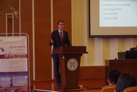 下午五点在p站 理工馆报告厅,杰夫校长举办了“中美文化交流”讲座,给与会同学生介绍了美国阿尔玛文理p站 相关情况、美国的教育体系以及如何适应美国的学习环境。