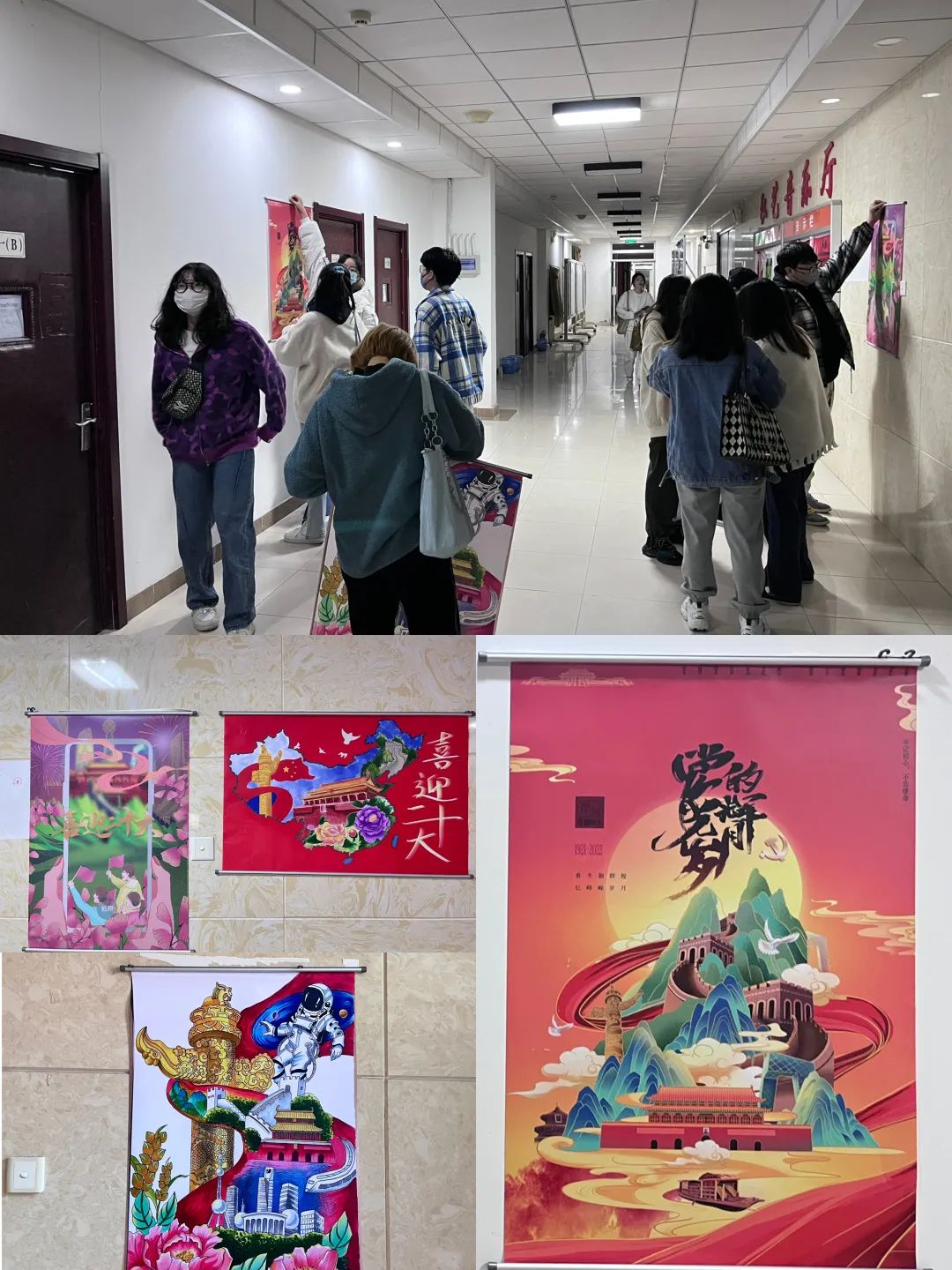 艺术p站 学生第一党支部开展“喜迎二十大,追梦正当时”主题党日活动,布置艺术p站 党建文化墙,装裱党支部成员手绘、板绘、海报等喜迎二十大主题作品