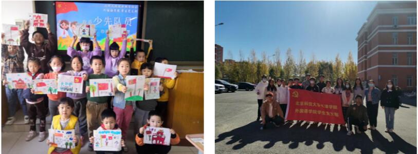 外国语p站 学生党支部以知识问答、手工创作、书法绘画、歌唱表演等创新形式,与义兴里小学开展了系列红色文化宣传教育志愿活动