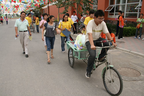 体育馆里,各系的志愿者都笑容满面地迎接捧着沉甸甸的通知书的新生们。馆外,领军训服装的地方,人也不会亚于报到处。队伍一直延续到体育馆门口。校园内的过道上,人流、车流也不少。在保安耐心地维护下,秩序井然。志愿者们分布在校园的每个角落,随时随地准备着为新生们服务。帮忙提行李、解答疑惑、指引道路、介绍情况,志愿者真诚的笑容让新生面对这样一个陌生的环境,消除了不适应,让新生感受到回家的感觉。