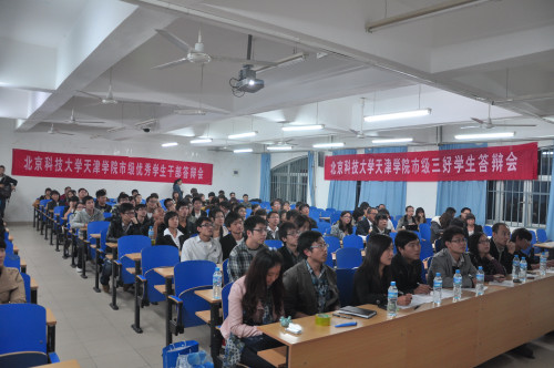 2010-2011学年天津市三好学生、优秀学生干部评选答辩在8教104举行,信息工程系党总支书记柯瑜、经济系党总各支书记迟铁、法律系党总支书记代鸿滨、材料科学与工程系分团委书记殷实、机械工程系分团委书记董玥、管理系分团委书记谢锦程出席答辩会并担任评委。参加此次答辩的共有来自八个系的16名同学。