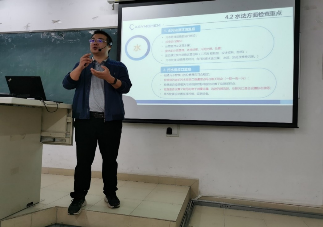凯莱英医药集团EHS部门熊先清主管为同学们上了一堂深刻的环保安全教育课,首先他从企业实际环保管理角度,从建设项目、水处理、废气处理、危险废物管理和环保应急管理角度介绍了环保相关的法律法规,并详细讲述了环境专业的毕业生如何成长为一名专业的EHS(环保、健康、安全)管理人员。他告诉同学们:一定要坚守安全底线,严守环保红线,EHS保护的是每一个人最基本的利益,学会如何保护自己和工友免受伤害、不受职业疾病困扰。同时他还鼓励同学们在大学中努力学习专业知识,夯实专业基础,扩大知识面,培养和锻炼自己解决问题的能力,学以致用。特别要注意培养自己的沟通、组织能力及团队合作精神,争取更快的脱颖而出成为一名合格的环保人才。