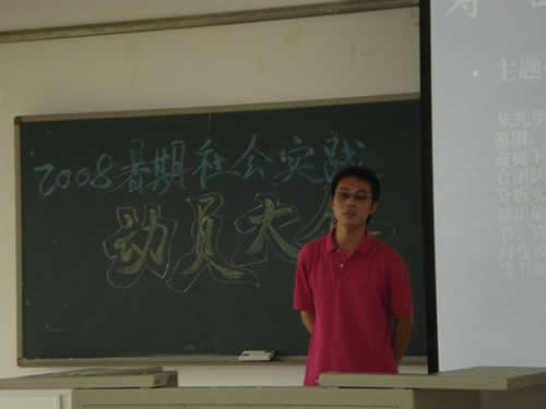 4点动员会正式开始。首先,团委副书记罗富臣向到场的同学简单介绍了此次动员大会的主要内容及意义,之后,2005级学生会主席吕林峰结合自己在2006年暑期社会实践成功的经历与现场同学作经验交流。在2006年暑期社会实践中,学生会组织的“保护母亲河”行动实践团取得了良好的效果,他通过制作的PPT和视频让同学们对社会实践有了一个初步的认识。