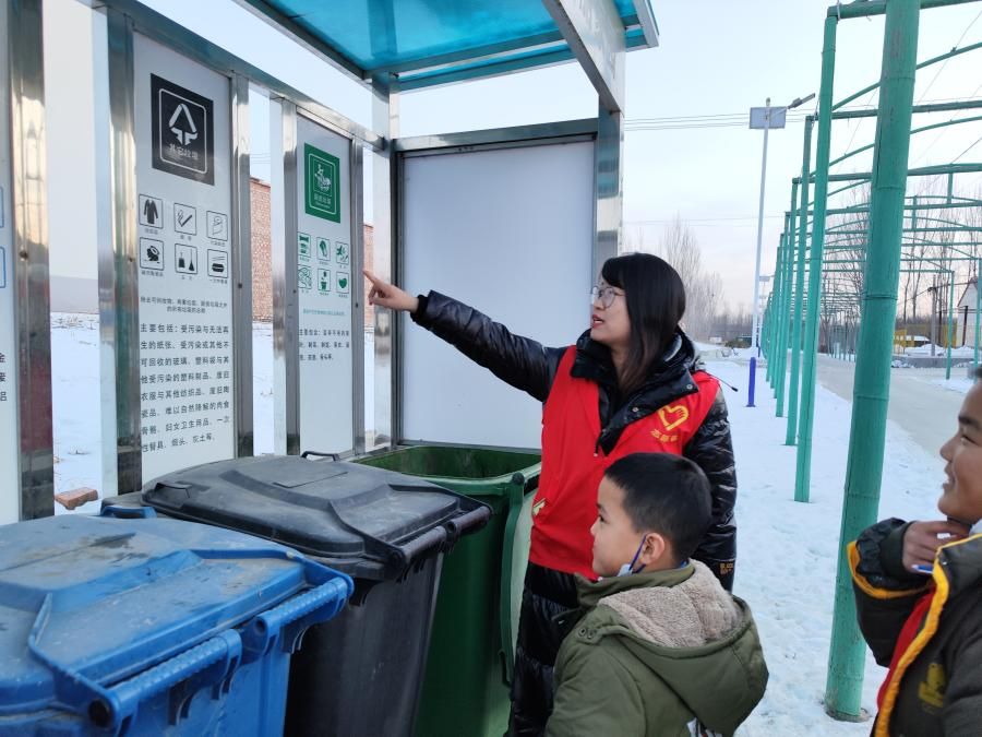 随后,志愿者带着孩子们来到村里的垃圾分类回收点,让小朋友们亲自动手进行垃圾分类操作,使他们在实践中掌握垃圾分类的技能。最后,志愿者给孩子们留了一个小作业:把所学的垃圾分类知识带回家,带动更多人参与垃圾分类。