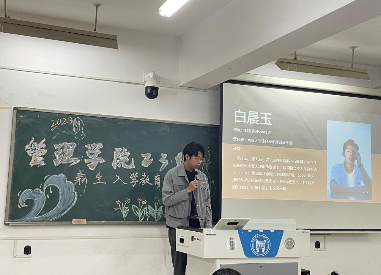 优秀学生代表白晨玉同学向同学们分享了自己创业经历和经验及获奖经历,介绍了许多在校期间可以参加的比赛和项目,鼓励大学生多多参加各类比赛项目,增加自己履历。