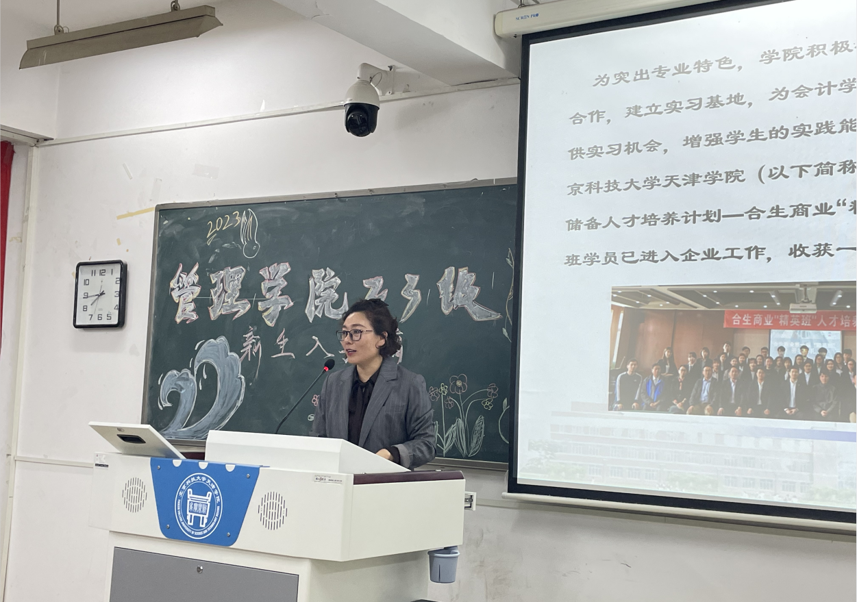 常务副院长王宾容老师对2023级新生的到来表示热烈欢迎,表达了自己对2023级新生的美好祝福和殷切期待。她倡导同学们应该做一个内心充实的财会人,希望同学们通过读书和运动来充实自己,秉承诚信的原则去对待专业考试,以诚信的态度与人交流,要做一个诚实守信、有底线意识、自律自信、三观正、品行佳、习惯好的人。她用成功学长的案例激励新生学会自律,合理规划自己大学四年时间。