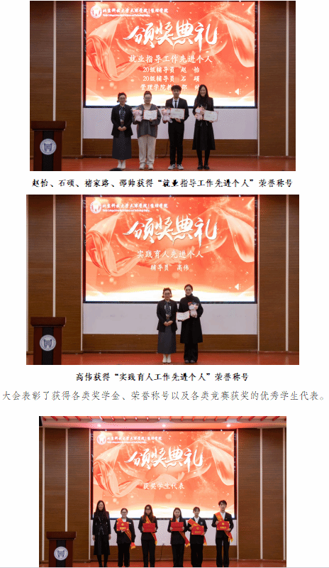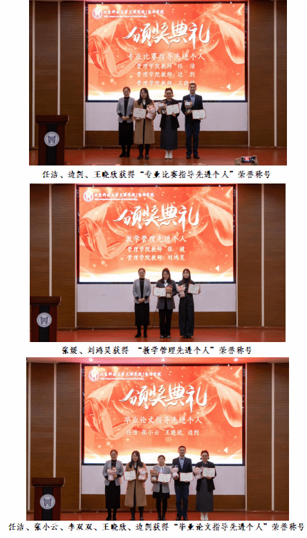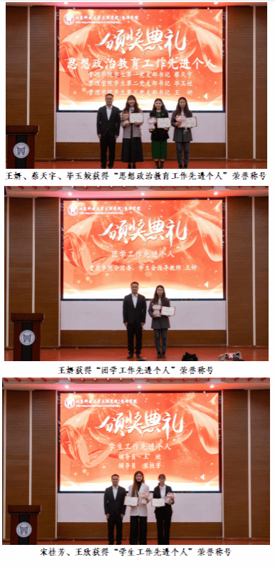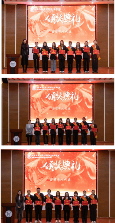 荣获“教学比赛先进个人”、“学生工作先进个人”等9个类别奖项的教师,以及荣获各类奖学金和荣誉称号的学生代表和集体进行了表彰。