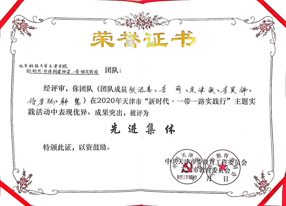 “新时代•外语构建桥梁,一带一路”实践团在2020天津市“新时代•一带一路”实践行主题活动中荣获“先进集体”称号;外国语p站