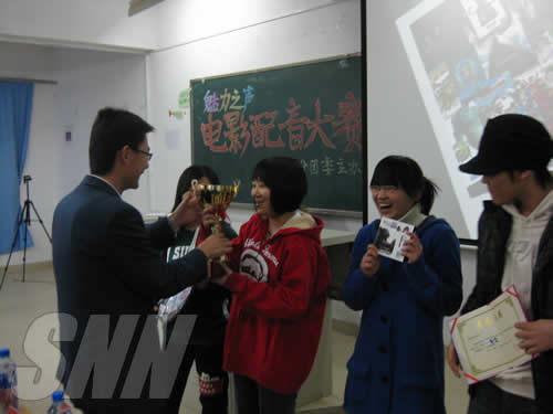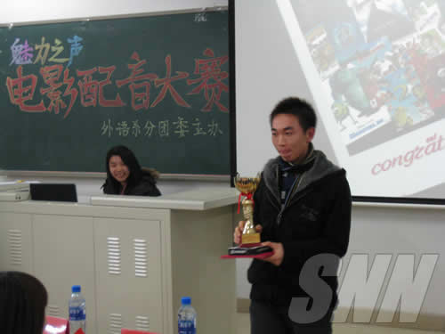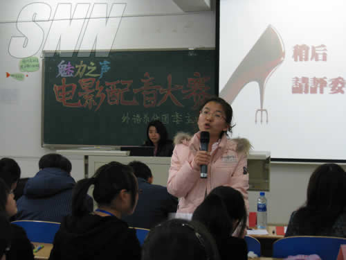 范围内调动起学生学习英语口语、提高自身英语水平的积极性,同时培养同学们的团队合作精神。经过上周的预赛,共有7支队伍进入决赛。参赛队伍带来的精彩的英文影片让现场观众大饱眼福,而各支队伍对影片的全新演绎更是让全场观众耳目一新,同学们流畅的口语、默契的配合也给在场的所有人留下了深刻的印象。穿插在比赛中的影片竞猜环节也让观众们参与到配音大赛中来,不少同学通过回答问题获得了纪念品,同时给我们带来了无尽的欢乐。