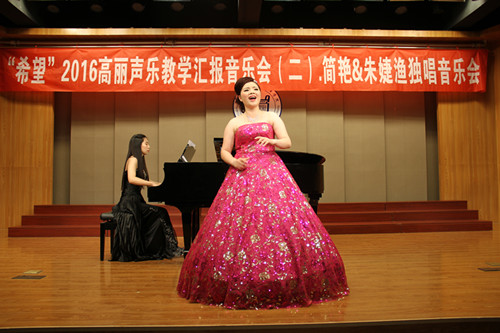 第一部分是由民族女高音简艳(2013级声乐演唱专业方向学生)带来的两首歌曲 《映山红》 和《纳西篝火阿哩哩》以及次女高音朱婕渔(2013级声乐演唱专业方向学生)的两首作品《怀念曲》 和《你们可知道》,把整场音乐会带入入美妙的音乐氛围中。
