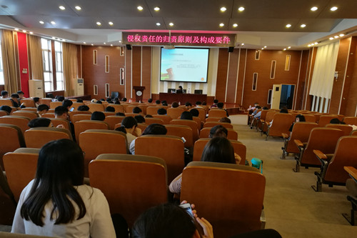 本次讲座,刘主任以“侵权责任的归责原则及构成要件”为主题,讲座开始以“电梯劝烟气死人”案例为切入点,分析讨论公平原则在侵权法领域的适用,以案析法,分析探讨侵权责任的归责原则及特殊侵权行为。接着从归责原则本身入手,系统的阐述了侵权原则的历史由来,详细分析了侵权责任的构成和表现,并用大量的实际案例将理论与现实紧密结合,从宏观和微观多个方面做出了详细的分析。刘主任讲授中引入法条作为依据,使整个讲座生动有趣,便于掌握知识的同时又增添了学习法学的兴趣。讲座结束后,同学们与刘辉法官进行李积极的互动,并得到了刘主任的详细的解答,帮助同学们更好的理解侵权责任的归责原则,学习到了丰富的实践经验。