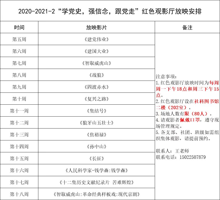 党建办公室与图书馆联合开设“学党史,强信念,跟党走”主题红色观影厅,每周定时组织师生党员和青年学生开展红色观影活动。