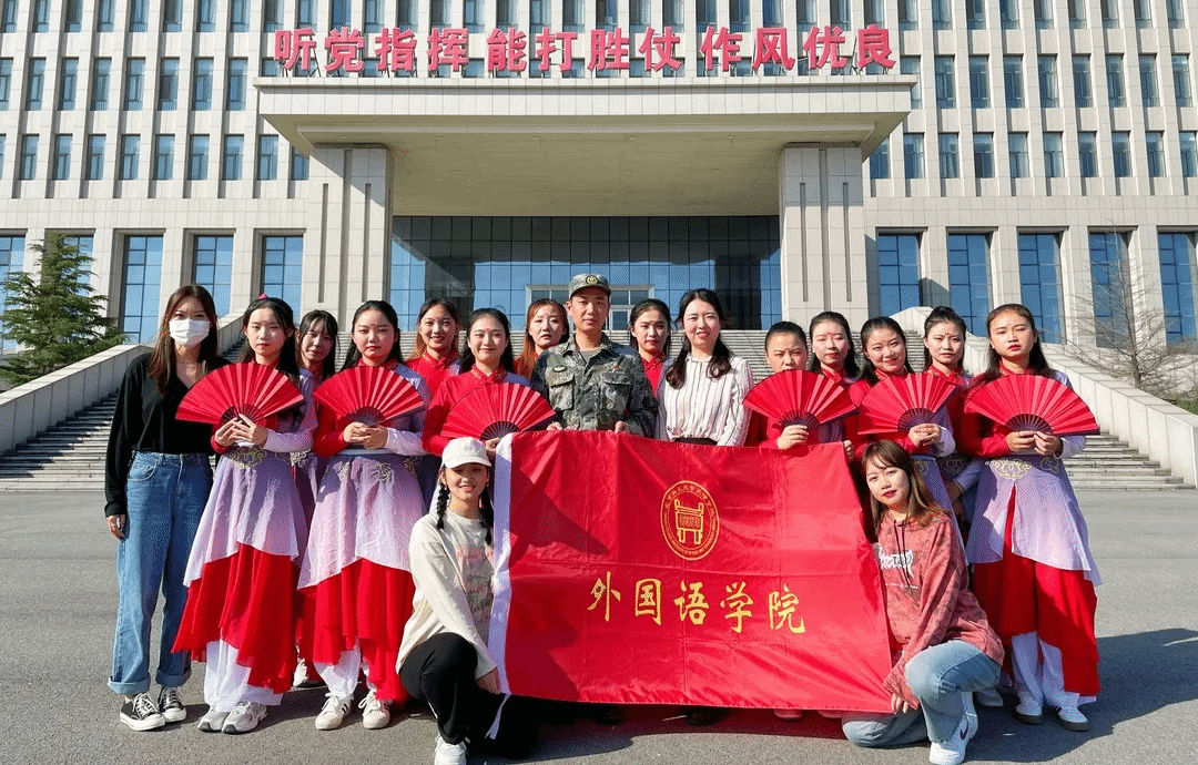 学子充分展现青年大学生的文艺风采。身着红白相间的舞蹈服,手执红色扇子。为绿色军营中展示出一抹中国红。