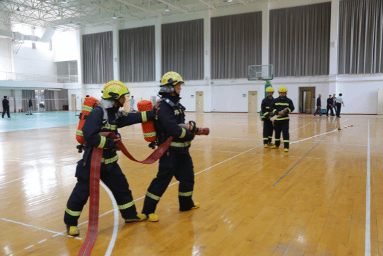 办公室、保卫处联合京津新城消防站在体育馆开展应急救援疏散专项演练活动。京津新城消防站站长袁野,保卫处处长何国钧,p站