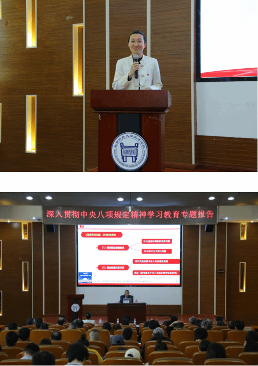 专题辅导中,范玉秋教授以“深入学习贯彻中央八项规定精神”为题,从新时代作风建设的重要性和必要性、中央八项规定与中央八项规定精神的内涵要义、深入学习贯彻中央八项规定精神的重大意义、推动中央八项规定精神学习贯彻走向深入四个方面,系统详细讲解了党中央开展深入贯彻中央八项规定精神学习教育的历史脉络和深层逻辑等,条理清晰、重点突出、内容丰富。为在场的师生呈现了一堂兼具理论深度和警示意义的作风教育课。