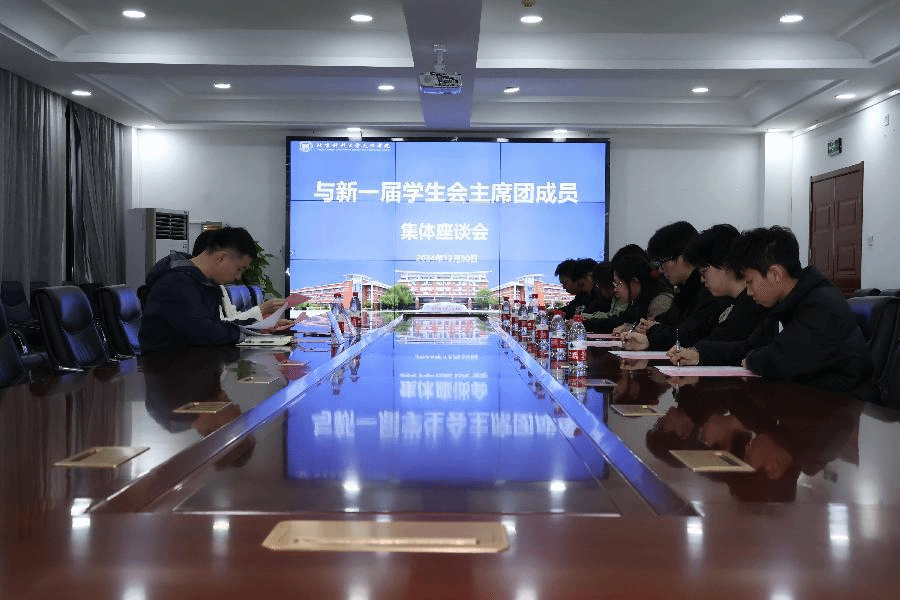 党委副书记郭雅娟与校学生会主席团成员进行集体座谈,团委书记周少华、团委副书记、学生会秘书长夏小茹参加座谈会。