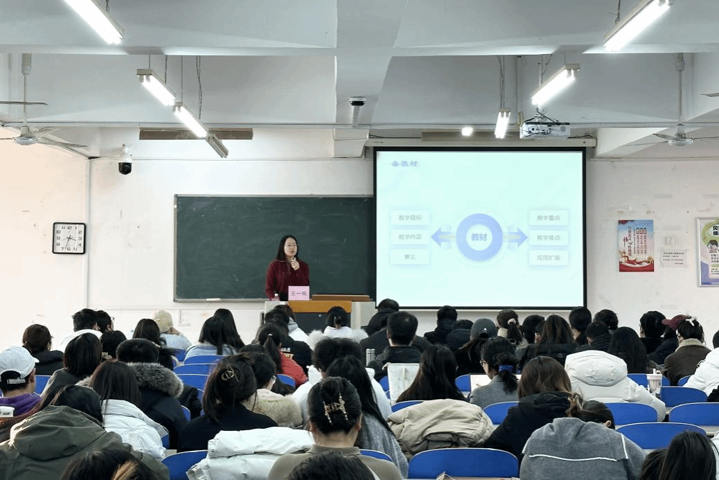 教师边剀作课堂教学经验分享。全体新入职教职工参加讲座。