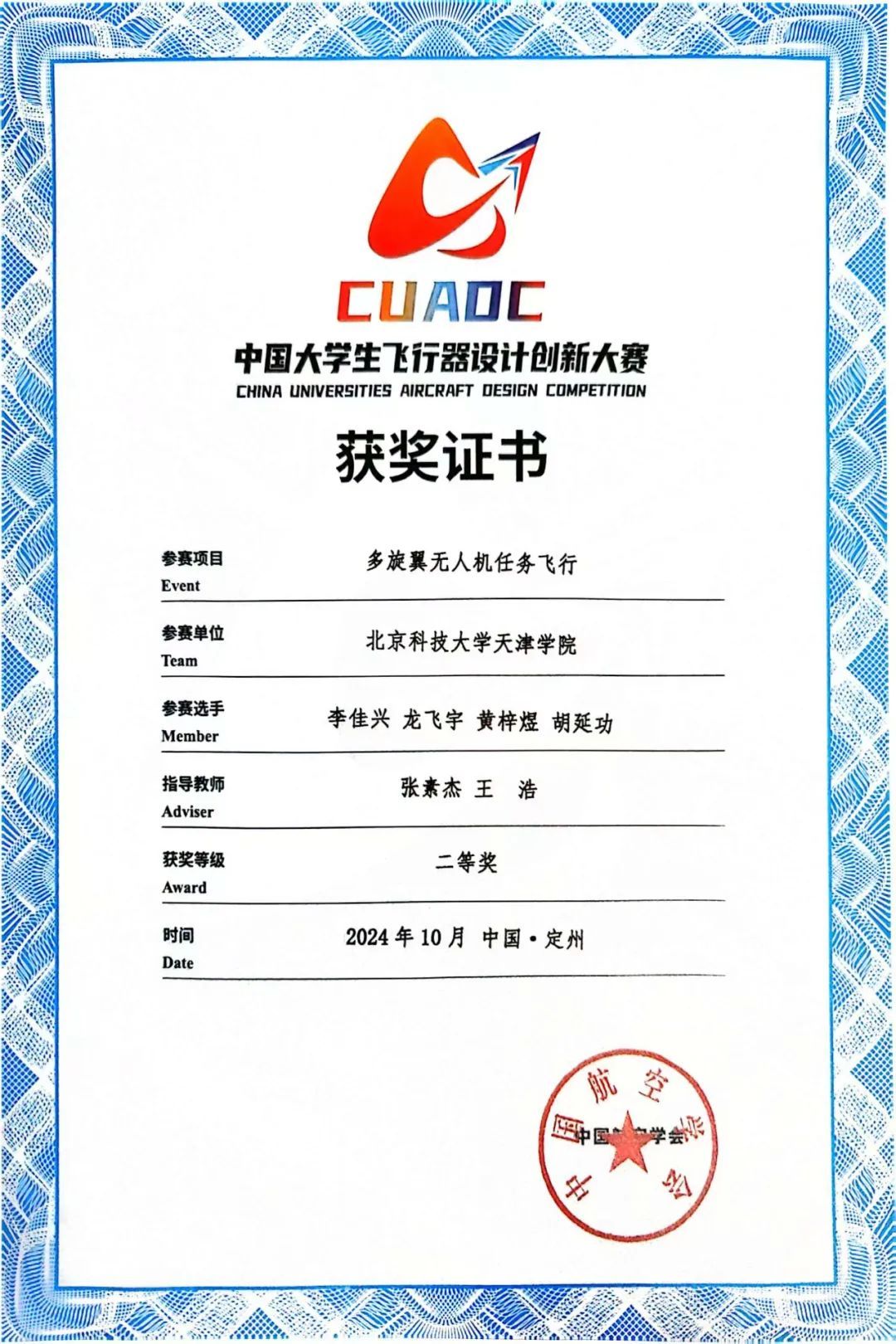 荣获2024年中国大学生飞行器设计创新大赛特别贡献奖。