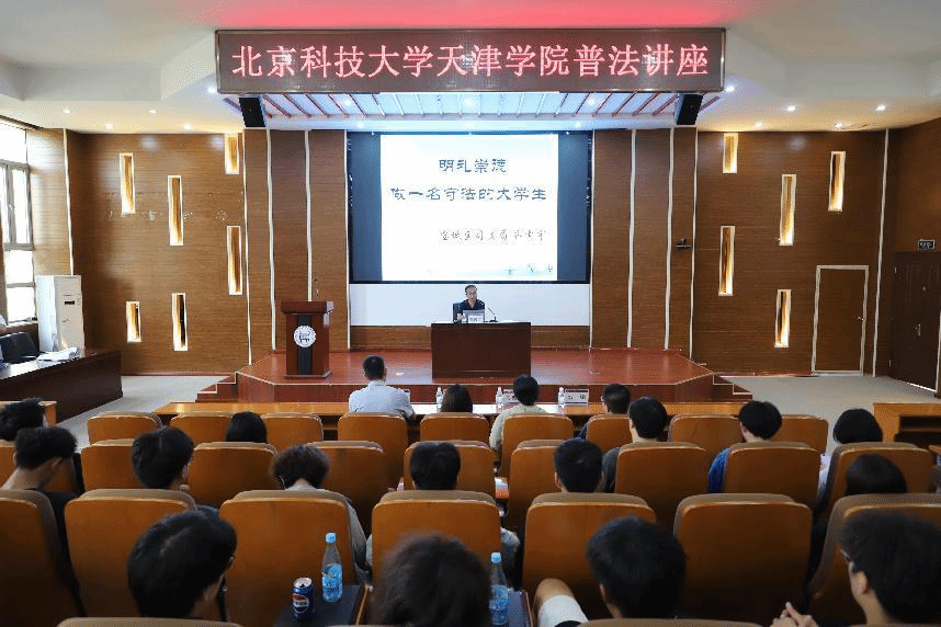邀请天津市宝坻区司法局行政复议审理与应诉科科长齐震宇作普法讲座。师生代表200余人共同聆听。