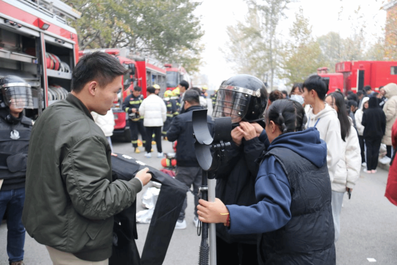 小广场前和理工馆消防通道,分别开展反诈签名和消防应急救援装备展示体验活动。一方面,通过发放消防、反诈安全宣传单,组织同学们参与校园防火和防范网络电信诈骗签名活动,深化普及防范反诈和校园生活消防安全常识;另一方面,让同学们深入体验消防救援装备和公安防暴装备,从“听我讲”到“我试穿”、“我试用”,转变安全宣传思路和宣传方式,增添宣传活动趣味性,激发广大学生群体参与安全宣传,学习安全知识的积极性和主动性。