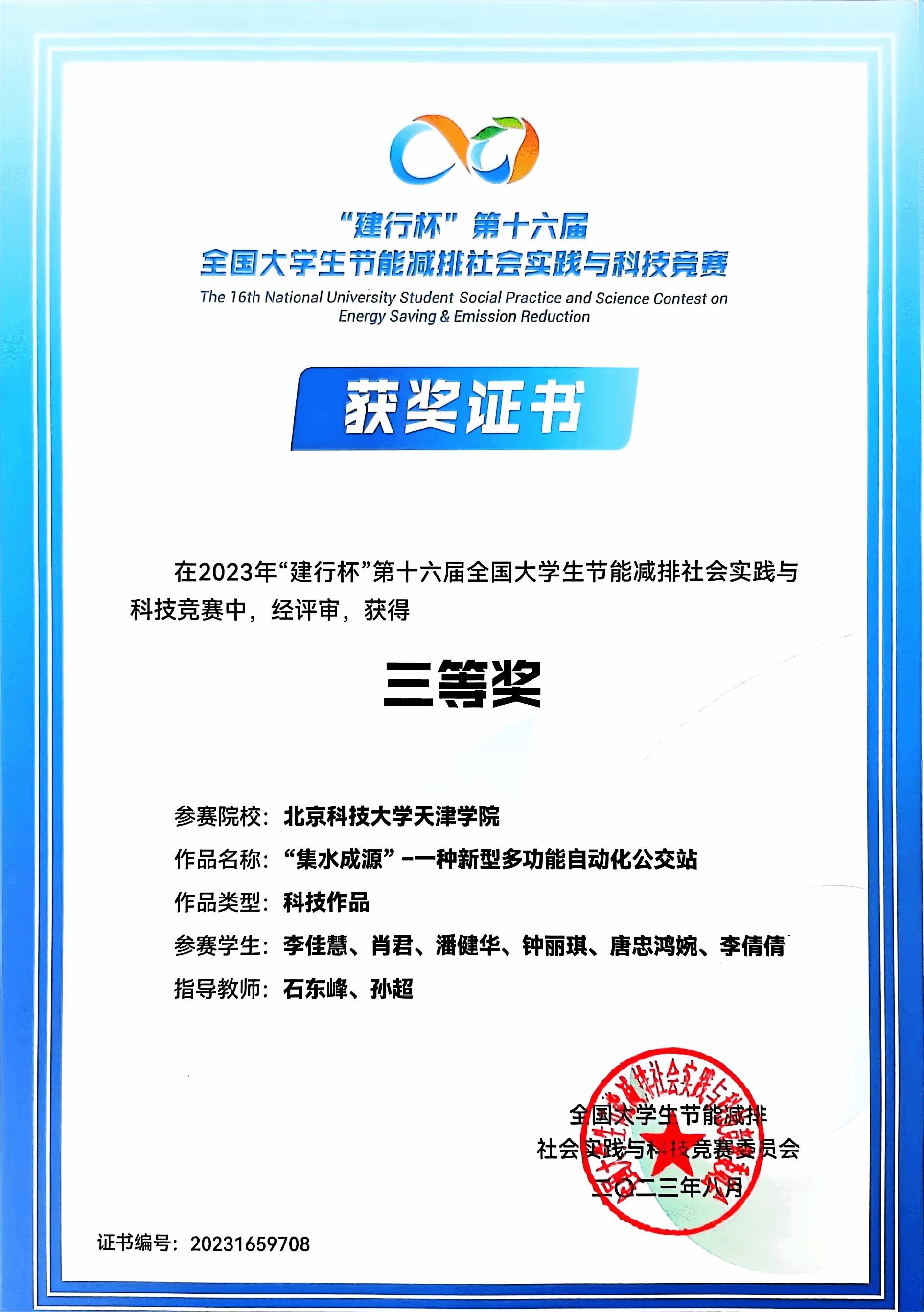 参赛作品“秸尽所能,资源创新”-秸秆与餐厨垃圾制新型生物质燃料一体化装置(刘俊杰和梁宝瑞老师指导)、“集水成源”-一种新型多功能自动化公交站(石东峰和孙超老师指导)获得全国三等奖(2项),并再次获得优秀组织奖。