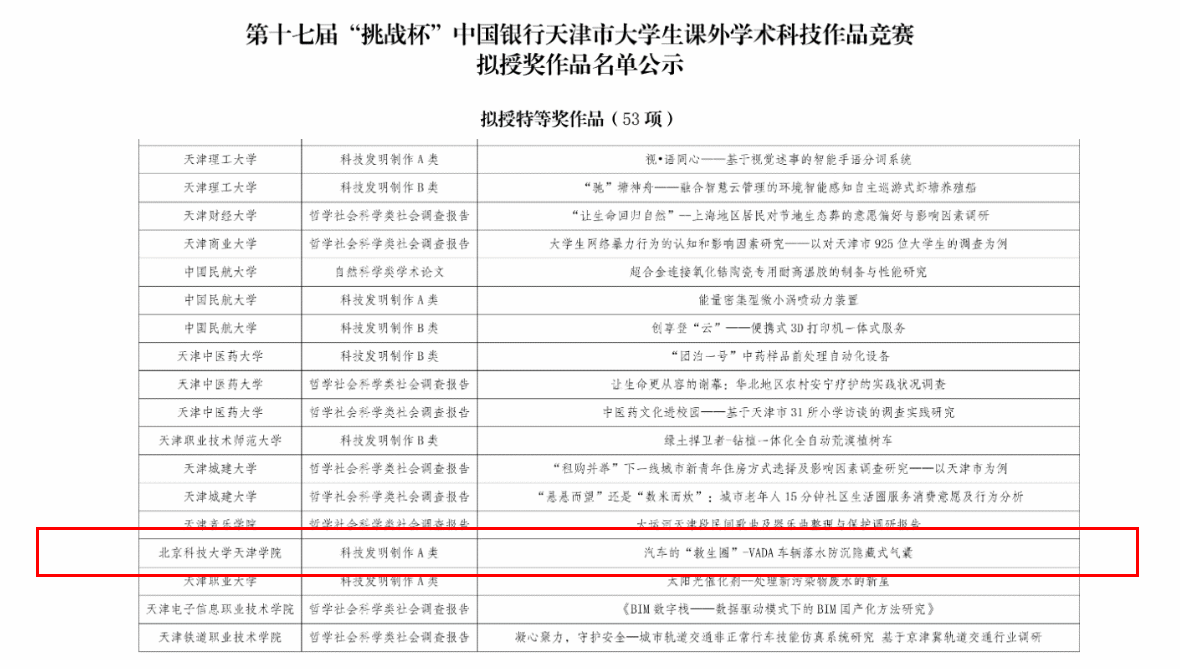 创业团队《汽车的“救生圈”—VADA车辆落水防沉隐藏式气囊》在此次市级竞赛中获得特等奖;《铝塑分离回收装置》、《速识清障—无人驾驶扫地车》2 个项目获得二等奖;《不水的超疏水-超疏水型二氧化铅电极可控性研制及其在废水处理中的应用》、《“援”来一空中应急救援的引领者》《生态环境无人机智能检测系统》、《MSE 增材前驱-增材制造大尺度连续梯度高强铝合金》、《陆空两栖机器人》、《用心制“罩”—光催化纳米氮二氧化钛口罩》6 个项目获得三等奖。