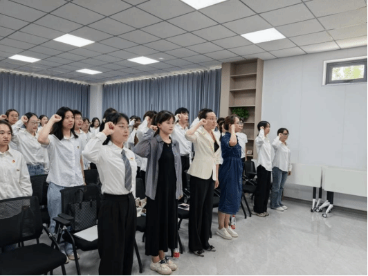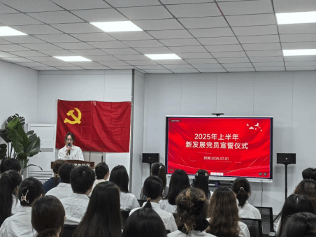 2025年7月1日,“一站式”学生服务社区勤学坊内洋溢着庄严而热烈的氛围,2025年上半年新发展党员入党宣誓仪式在此隆重举行。党委副书记郭雅娟、党委办公室常务副主任张莉以及74名新发展党员参加宣誓仪式。