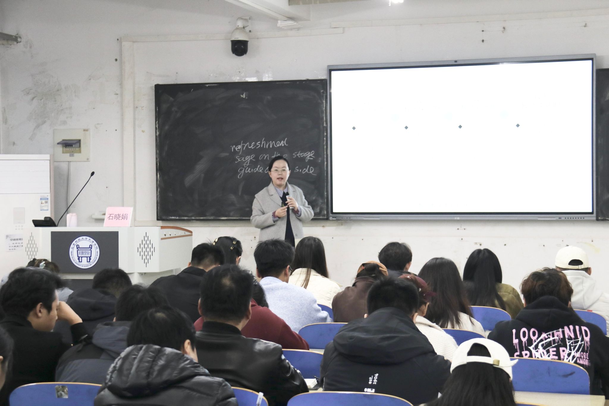 石晓娟作课堂教学经验分享。全体新入职教职工参加讲座。