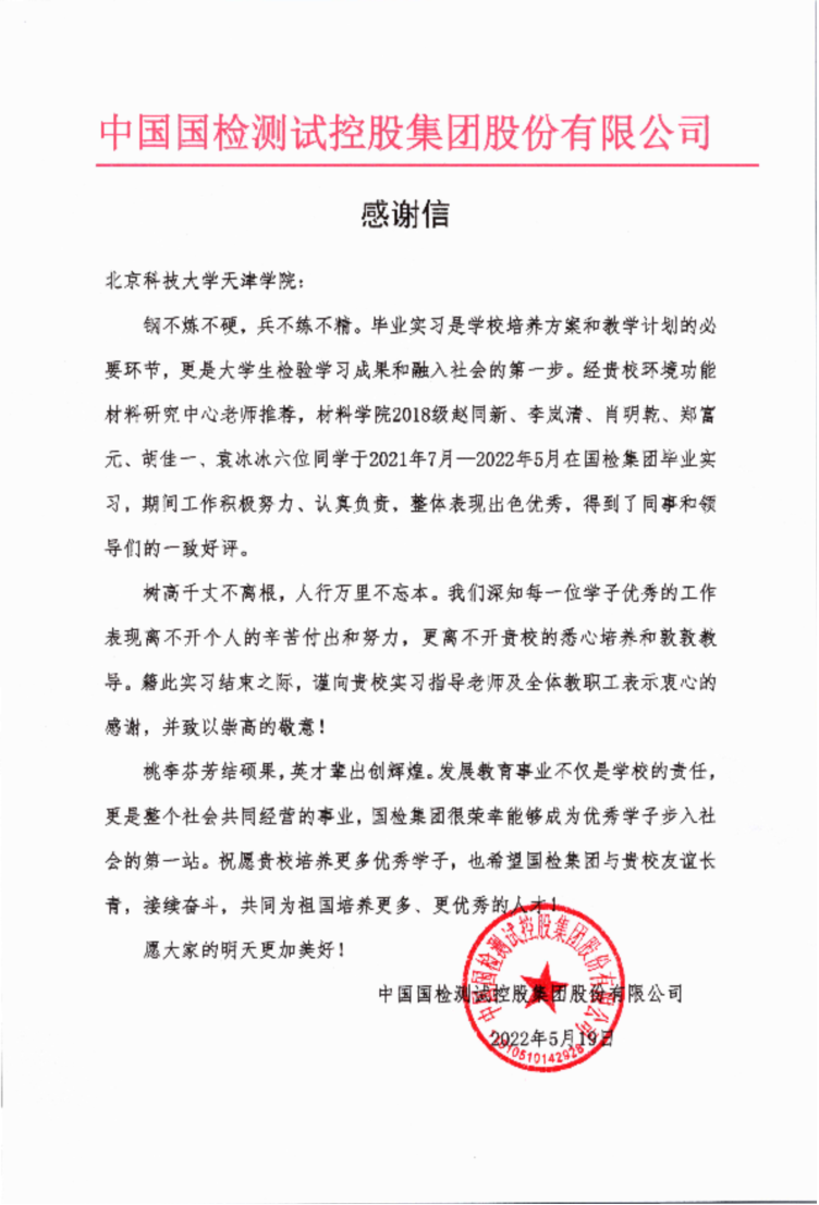 5月19日,p站 收到来自中国国检测试控股集团股份有限公司(国检集团)的感谢信,信中对p站 材料系六名在该集团参加毕业实习学生的优秀表现给予了高度评价,对p站 的应用型人才培养模式给予了积极肯定,对p站 老师们表...