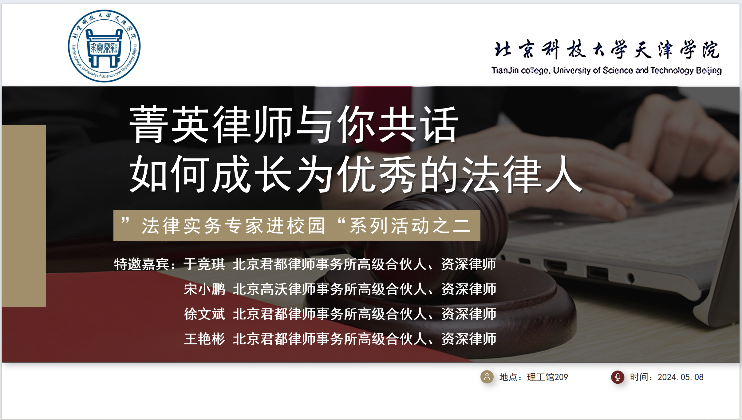 5月8日15时,法律系“法律实务专家进校园”第二期活动在理工图书馆209成功举办。本期活动以“菁英律师与你共话--如何成长为优秀的法律人”为主题,特邀北京君都律师事务所高级合伙人、资深律师、p站 兼职教授于竞琪,...
