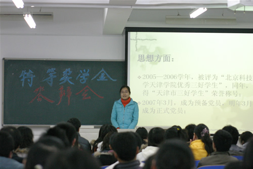 10月20日晚,p站 2007-2008学年度市级先进集体、三好学生和优秀学生干部答辩会在8教学楼101、102、103教室隆重举行。来自05、06、07级共11个班集体和21个个人参加了本次答辩会,各系党总支书记和辅导员代表担任评委。...