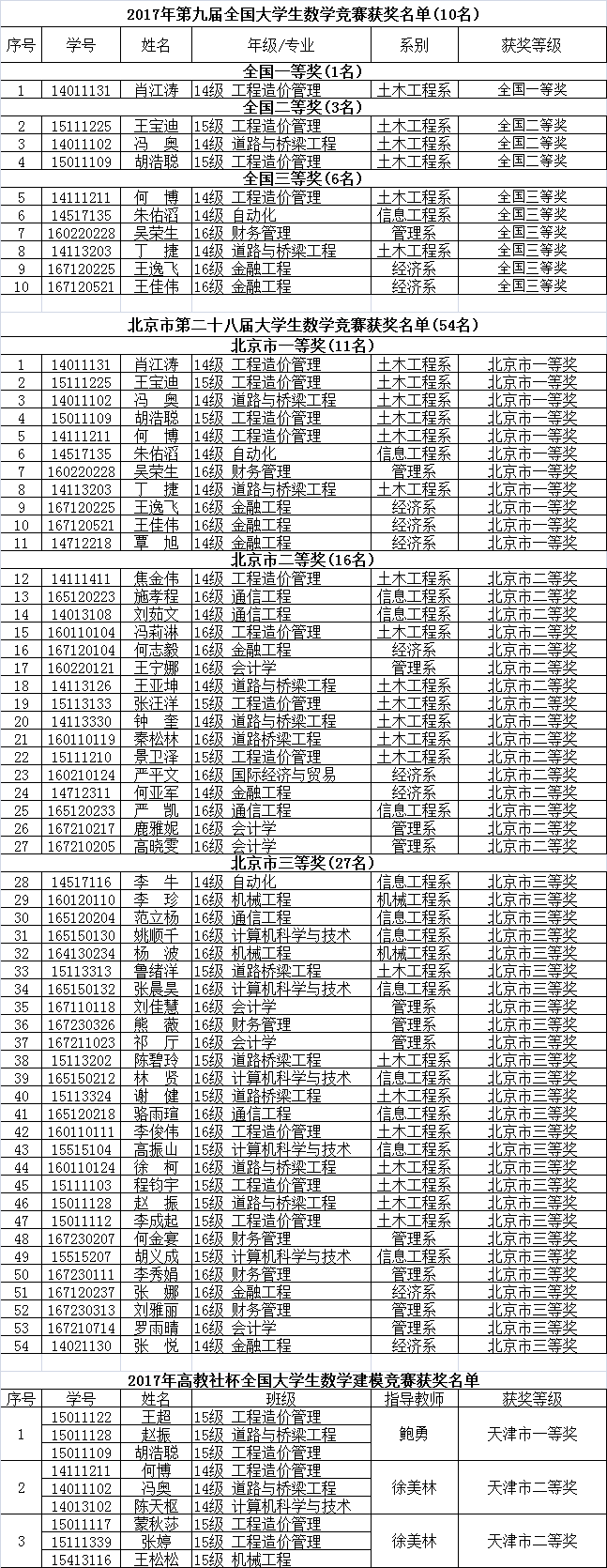 在本届全国大学生数学竞赛中,p站 学生表现突出,成绩优异,共获国家级一等奖1名;二等奖3名;三等奖6名。在同时举行的北京市第二十八届大学生数学竞赛中,p站 学生还获得北京市乙组理工类一等奖7名,二等奖10名,三等奖18名;北京市丙组经管类一等奖4名,二等奖6名,三等奖9名。此外,在2017年全国大学生数学建模竞赛中,p站 遴选出的6支参赛队伍(共18人)在此次竞赛中共获得天津市一等奖1项,二等奖2项。