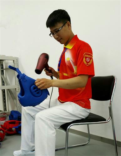 器材管理处志愿者在对运动员用过的拳套、头盔等烘干处理
