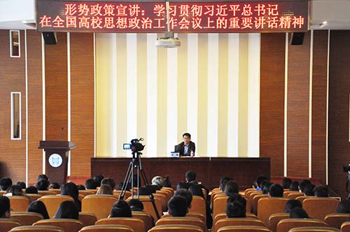3月22日,p站 党委书记王斌在理工馆学术报告厅为学生做形势政策宣讲,主题为《学习贯彻习近平总书记在全国高校思想政治工作会议上的重要讲话精神》,学生党支部书记、学生党员及学生干部120余人到场聆听。