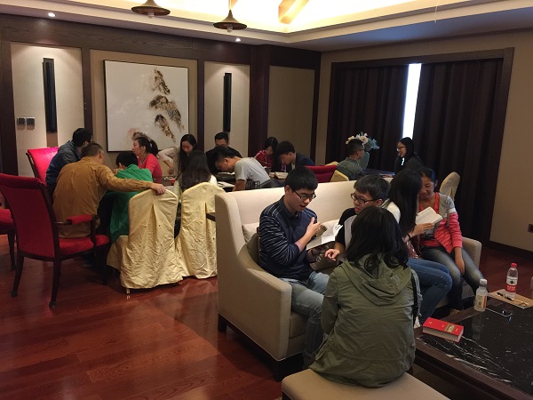 集体培训时间,选手们相互搭档、相互挑战,队友之间的默契配合、对手之间的激烈对垒让赛前的气氛变的愈发紧张仿佛让选手置身比赛现场。培训中,无论是“踢馆”游戏还是抢答游戏,马善智和罗叶楠都能应付自如、脱颖而出,他们对于词汇的运用和描述熟练度有了很大的提高。