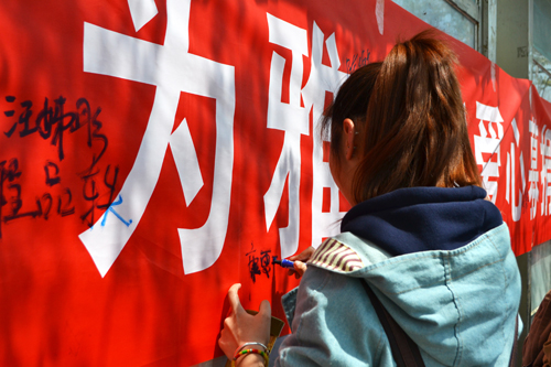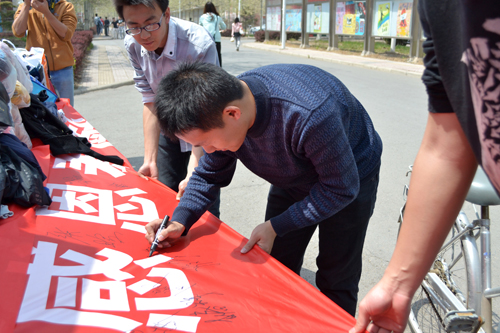 募捐现场,天院师生纷纷解囊相助,为地震灾区的人民奉献了自己的爱心。前来的同学们纷纷捐出了自己的一份心意,10元、50元、100元……募捐箱里充满了天院师生对灾区人民的深切关心。现场的签名横幅上,募捐师生还写下了他们对千里外受灾同胞的祈福寄语,盼望亲人平安,盼望雅安新生。“只因这一刻我们感同身受,我们都是雅安人”。同时,同学们还捐出了部分衣物,用不同的方式献出自己的一份爱心。