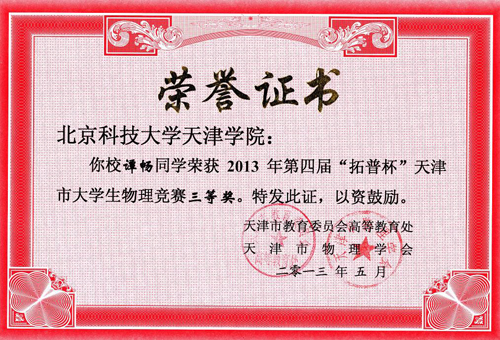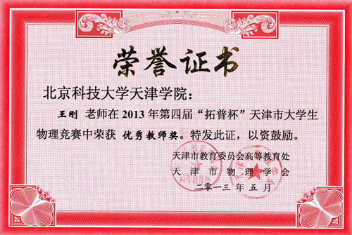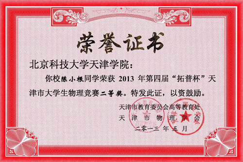 4月13日,由天津市教委高教处会、天津市物理学会共同主办的第四届天津市“拓普杯”大学生物理竞赛在军事交通p站 举行。p站 共有25人参加了此项赛事。本次物理竞赛得到了p站 领导的大力支持和教务处等部门的全力协助,同时在基础部全体教师的努力下,获得了3个奖项。其中陈小根同学获得二等奖,谭畅同学获得三等奖,王刚老师获得优秀教师奖。