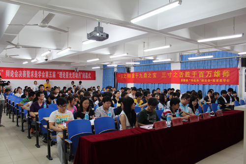 本届辩论赛为期四周,本着活跃校园气氛,开阔学生视野,丰富同学们的课余生活的宗旨,经过八系淘汰赛、四强半决赛等环节,最终,经济系代表队、管理系代表队杀入决赛。冠亚军争夺赛中,两队围绕着“代沟产生的主要责任在于子女还是父母”展开了激烈的辩论。参赛双方你来我往,唇枪舌剑却又不失风度,你攻我防,转换有序,赛场气氛慢慢升温。在自由辩论阶段,赛场气氛达到高潮,双方引用诸多实例辅以论证,观点新颖,思维灵活,妙语连珠,博得了满堂喝彩,充分展示了p站 学子扎实的理论功底和宽广的知识面。整场比赛精彩纷呈,现场气氛活跃,评委和观众听得津津有味,不时爆发出笑声和热烈的掌声。比赛结束,田勇老师对本场比赛进行了详实的点评,在给予参赛选手肯定与鼓励的同时,也指出了双方存在的不足之处。随后,求是学会第七届理事会会长姚楚航作求是学会第五届“理论星光活动月”总结汇报,系统的梳理了求是学会第五届“理论星光活动月”的工作,并对求是学会未来的发展提出了希望。
