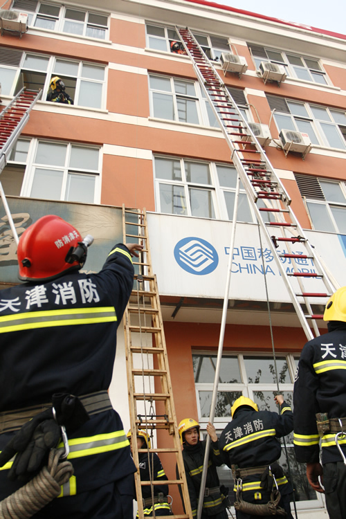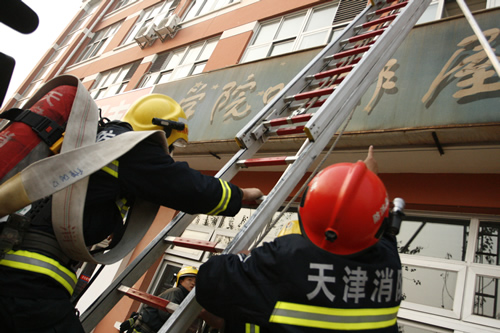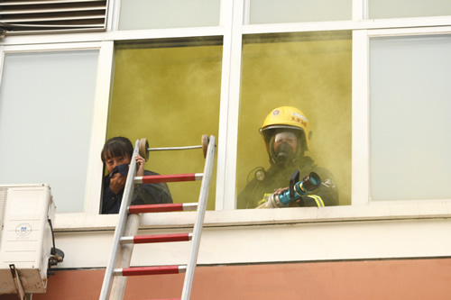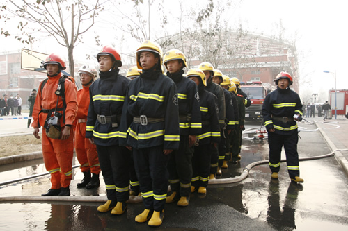 为了搞好这次联合演习,p站 制订了严谨、详细的演习方案,成立了领导小组,由院长郭景文担任组长,党委书记王斌、副院长曹连东、财务总监肖祖刚担任副组长,现场总指挥由天津市公安消防局宝坻支队办公室主任苑增江担任,学生处处长盛佳伟、保卫处处长何国钧担任副指挥。下午3点30分,演习正式开始。p站 保卫处处突小分队战斗员迅速穿上消防战斗服,佩戴空气呼吸器、防毒面具及无耻锯、扩张器、剪断器等先进的破拆工具进入火场进行第一时间的救援与疏散。其他保安员迅速拉开警戒线,维护现场秩序,配合疏散。参加演习的学生在消防员的引导下用湿毛巾捂住口、鼻,从学生公寓有序撤离。
