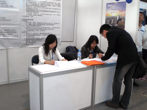 就业指导中心副主任郭雅娟等5名就业指导中心工作老师带领毕业生8:30到达会场,并第一批进入招聘现场。应聘毕业生在不同的展台前仔细察看是否有合适的职位、递送简历、与单位代表进行简单对话。