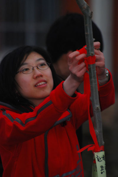 同学们为小树系上红丝带