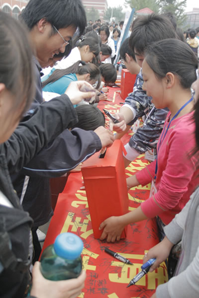 领导及中层领导干部、广大师生们纷纷捐款并在条幅上签字。表达关注灾情的心意及祝福灾区人民的爱心。